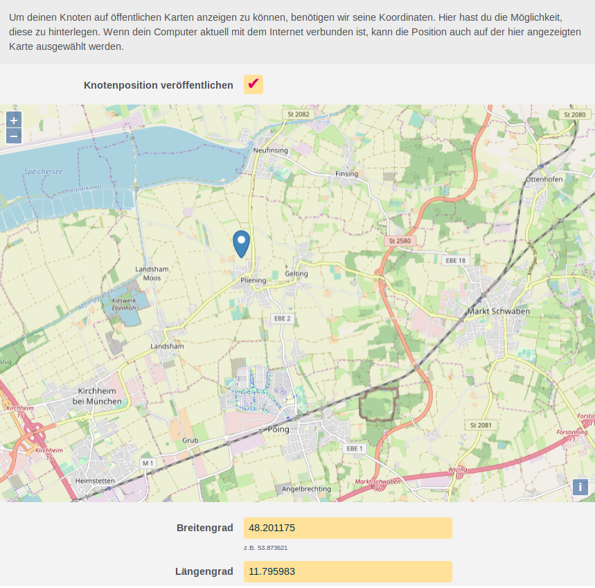 Die Speicherung der Geo-Koordinaten erfolgt direkt auf dem Knoten selbst, Diese können auch später über die WEB-GUI bzw. mit Hilfe einer SSH-Verbindung zur Administration jederzeit geändert oder gelöscht werden.