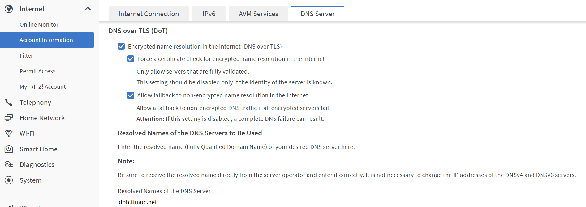 Since Fritz!OS 7.20, it has been possible to configure DoT servers directly in the Fritz!Box. Go to Internet → Account Information → DNS-Server. At the bottom field, enter dot.ffmuc.net as the hostname: